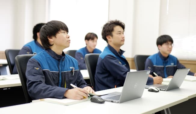 各種取扱いメーカー等の外部研修に参加したり、メーカーから講師を招いて商品や設備についての商品知識を学んだり、施工を行う為の技術的な研修を行うなど、仕事をしていく上で必要なスキルをレベルに応じて身につけることができます。